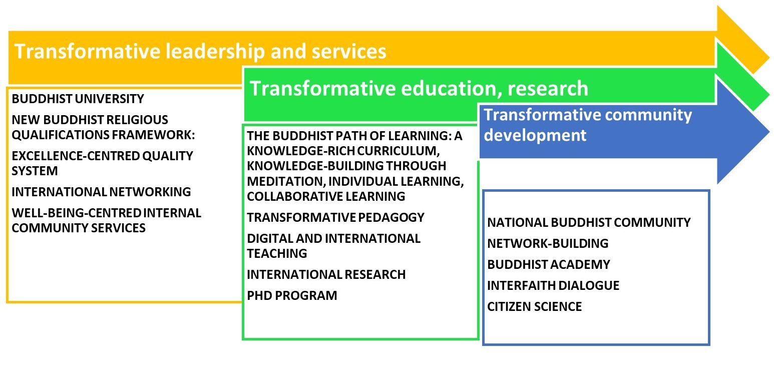 Like other institutions of Hungarian higher education, The Gate of Dharma Buddhist College had previously adopted an Institutional Development Plan rather than a strategic program. The newly established practice introduces an innovation: the ‘Transformative Buddhist University’ strategy, which covers the period 2025–2035. In its first phase, the focus is on strengthening international competitiveness, while in its second phase the aim is to enhance the transformative role played in the international development of Buddhist higher education.